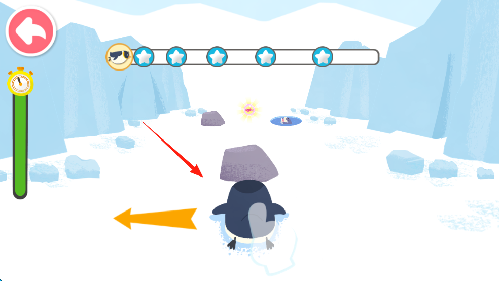 2、操控企鹅,沿箭头方向,绕过石头,收集道具,向目标点前进。