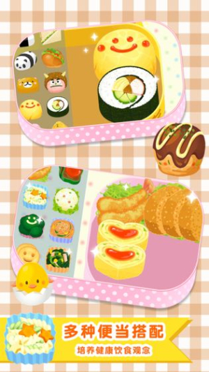 1、玩家可以从数十种食材中自由选择喜欢的菜式,包括米饭面条蔬菜肉类和水果 ,创造属于自己的独特便当组合。