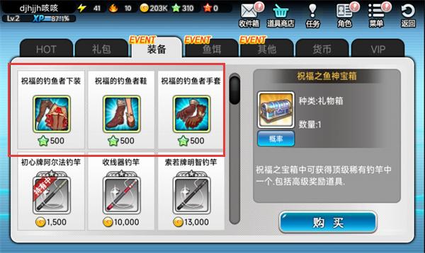 2、当我们的金币或星币累积一定数量的时候,就可以到道具商店购买衣物和钓鱼竿。