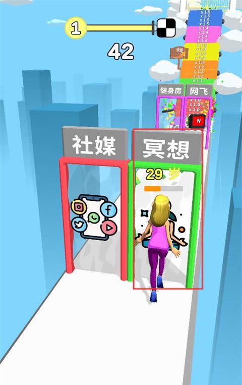 3、角色形态变化:年龄变化影响角色跑酷能力,青年期跳跃高度高,老年期移动缓慢但可触发经验加成,增加策略选择维度。