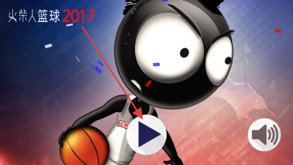 1、启动界面,点击播放按钮开始,火柴人角色持球,呈现“火柴人篮球2017”标题,可开关音效。