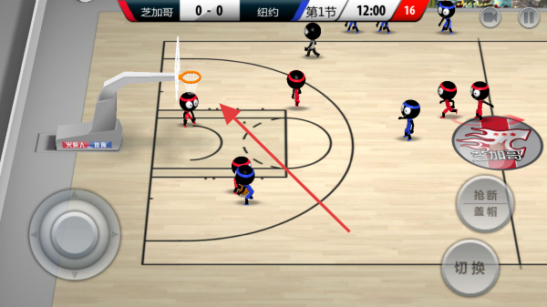 3、比赛界面,芝加哥vs纽约,操控火柴人球员,利用“抢断”“盖帽”等按键,在球场攻防,推进比赛。