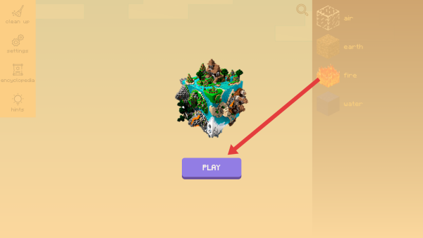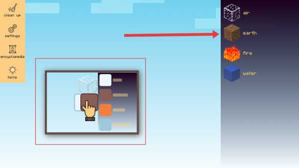 2、在合成界面,将箭头指向的“earth(土)”元素,按指引拖入合成框,尝试合成新方块。
