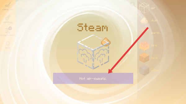3、合成“Steam(蒸汽)”后,点击【Hot-air=steam】确认,解锁新元素,用于后续创造。