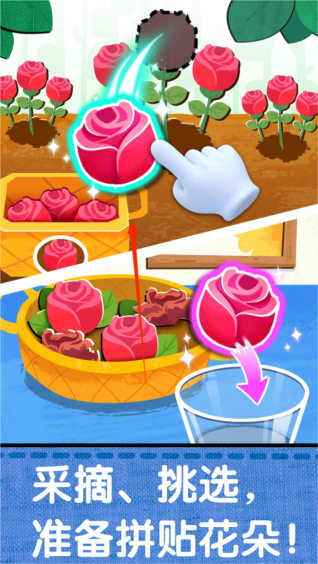 1、采摘玫瑰,挑选花朵,按提示拼贴,组合成装饰,完成花朵创作。