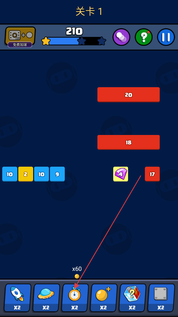1、进入关卡1界面,确认上方目标分数等信息,准备开启弹球挑战,利用弹球撞击方块。