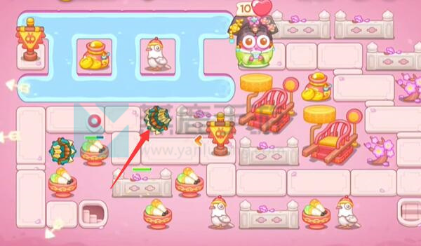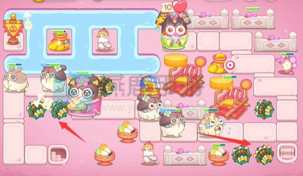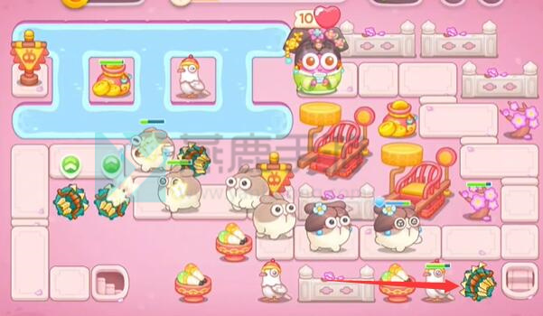 2、关卡目标:布置防御塔(如风扇塔、鞭炮塔),阻止怪物(熊猫、鸡等萌化敌人)吃掉顶端“白萝卜”(核心保护目标,血量10点)。