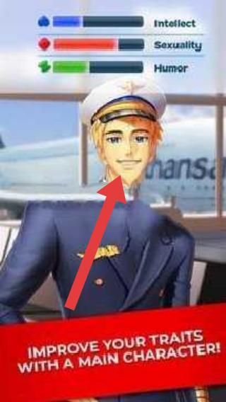 2、在角色养成游戏中,针对箭头指向的男性角色,提升“Intellect”“Sexuality”“Humor”属性,增强角色能力。