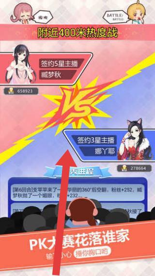 3、参与直播PK游戏的“附近400米热度战”,选择支持的主播(如藏梦秋),助力其击败对手(娜丫耶),赢取奖励。