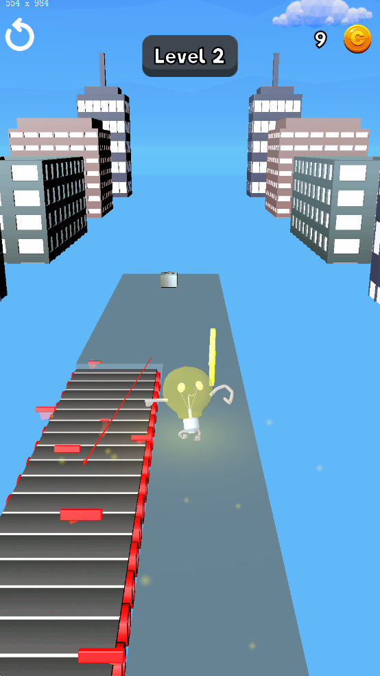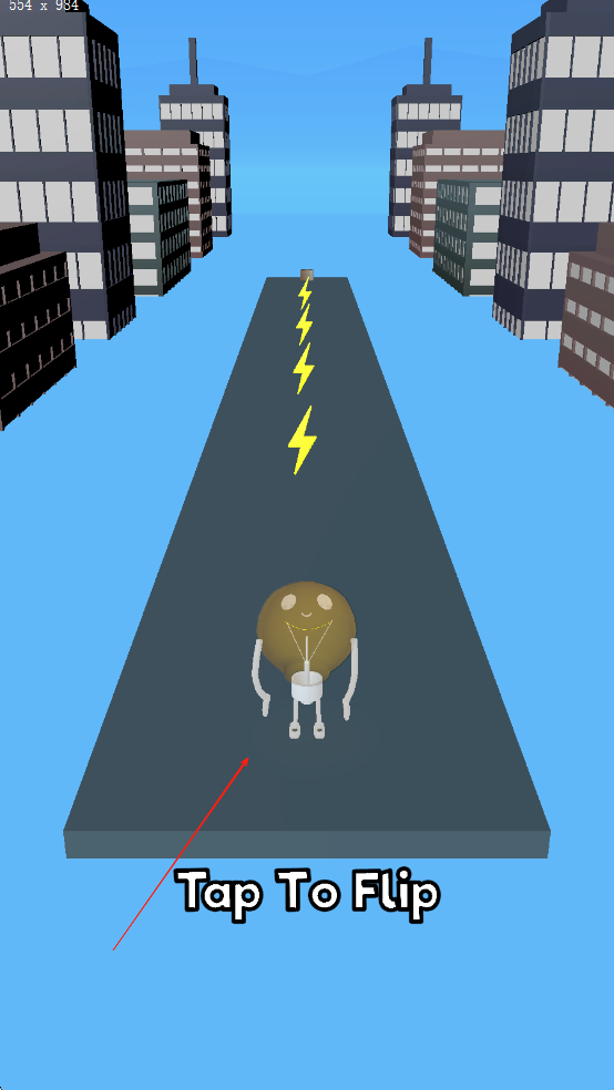 1、进入游戏后滑动屏幕控制灯泡左右移动,点击屏幕完成跳跃动作,在布满电流陷阱的初始赛道上收集蓝色电力能量,熟悉基础跑酷操作。