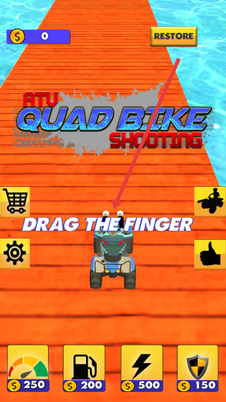 1、在启动页,跟随“DRAG-THE-FINGER”指引,滑动手指,操控四轮摩托,开始游戏。