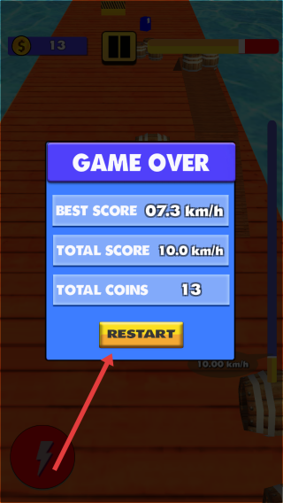 3、游戏失败后,在“GAME-OVER”界面,点击【RESTART】,消耗金币(如13个),重新挑战关卡。