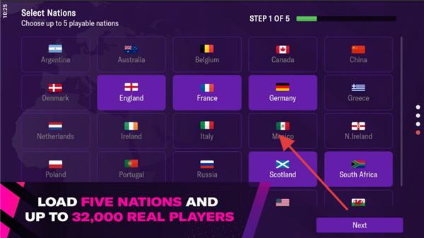 2、选国界面(STEP1OF5),可挑选最多5个可玩国家(如Argentina、England等),选好点“Next”,加载含真实球员的数据库。