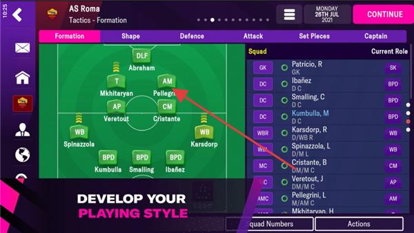 3、战术界面,以AS Roma为例,可设置阵型(如DLF、AM等站位)、战术,调整球员(Patricio、Ibanez等)阵容,打造专属踢球风格。