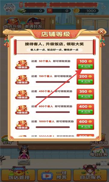 2、接待客人积累数量,达成店铺等级目标(如1级饭店需50人),领取金币奖励。