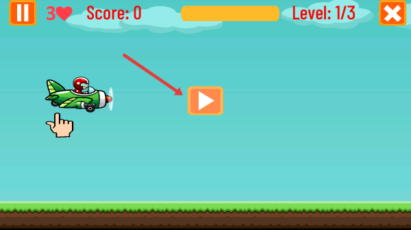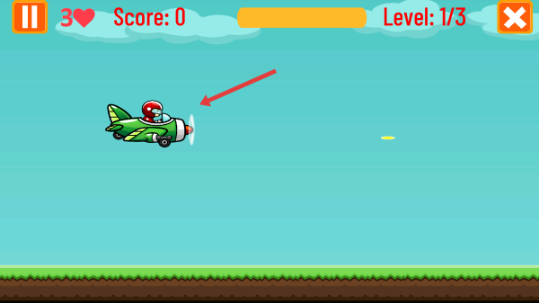 2、飞行躲避:在飞行中躲避障碍(黄色子弹、木箱),通过点击或滑动控制飞机移动,保持3颗爱心(血量)。