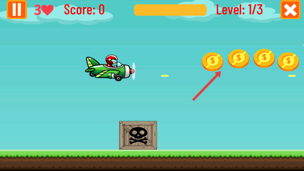 3、金币收集:飞行路径上收集金币,积累分数(Score),成功通过关卡,解锁下一关,体验趣味飞行挑战。