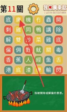 2、到答题关卡(如第11关),根据题目提示(如词语解释),从方格中选对应广东话答案。