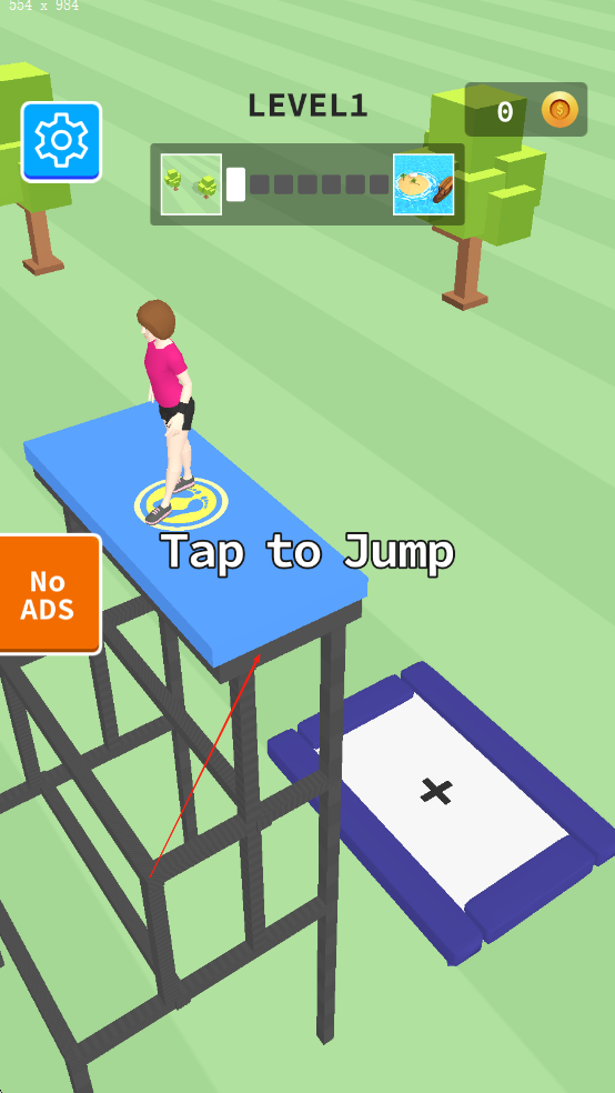 1、进入游戏后在关卡选择界面点击开始,滑动屏幕调整角色跳跃角度,点击屏幕释放弹力,初次闯关需熟悉蹦床的反弹力度与抛物线轨迹,完成基础跳跃教学。
