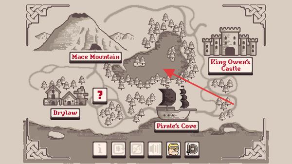2、地图界面,显示“Mace Mountain”“King Owen's Castle”等地点,选择目标区域(如森林),推进骑士探索路线。
