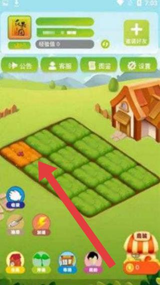 1、点击农田中箭头指向的土地,进入种植流程,可从仓库选种子(若有),播种作物。