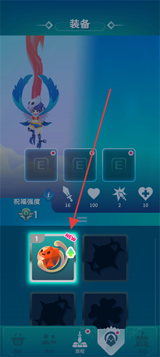 2、装备界面,点击带“NEW”标识的装备(如橙色宝石),进行穿戴或升级,提升角色属性与战力。