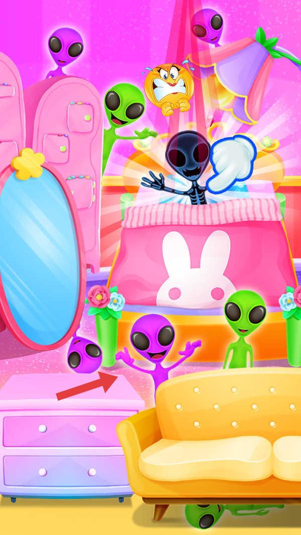 1、在粉色房间场景中,点击箭头指向的紫色外星人,完成互动收集,推进关卡。