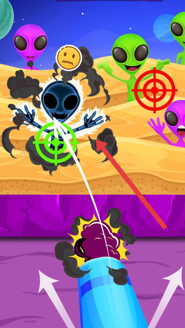2、瞄准沙漠中的黑色外星人,发射攻击将其消灭,留意周边敌人干扰。