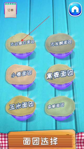 3、进入面团选择页,依据订单要求(如香草面团),点击对应面团(香草面团),开始制作餐品。
