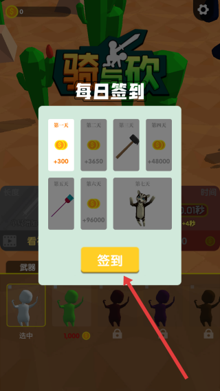 1、进入游戏,在“每日签到”弹窗点击【签到】,领取金币、武器等奖励,积累资源。