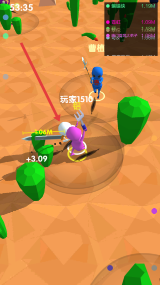 3、战斗中,靠近箭头指向的敌人(如粉色角色),利用武器攻击,击败对手,提升竞技排名。