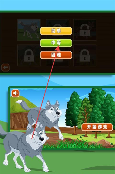 1、进入游戏,选择难度(简单/中等/困难),开启狼主题拼图挑战。