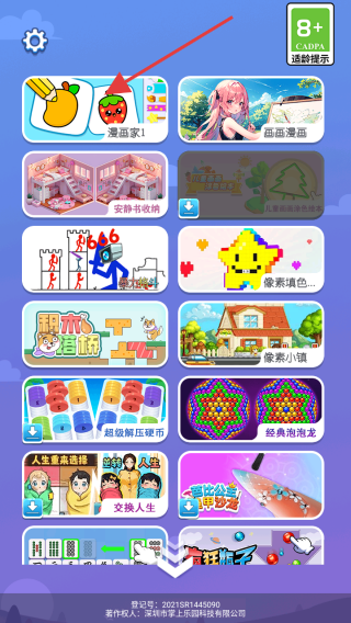 1、进入界面后,在游戏列表,点击箭头指向的【漫画家1】图标,进入绘画创作游戏。
