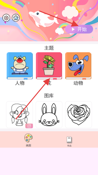 2、进入主题选择页,选箭头指向的【花卉】主题(或人物、动物),点击右上角【开始】,开启绘画任务。