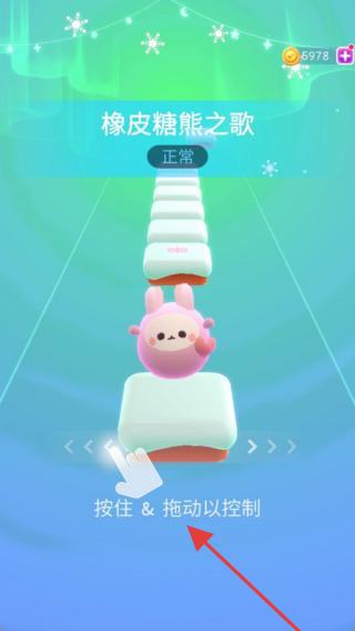 1、进入【橡皮糖熊之歌】,按提示【按住 & 拖动】控制角色,开始踩砖块闯关。