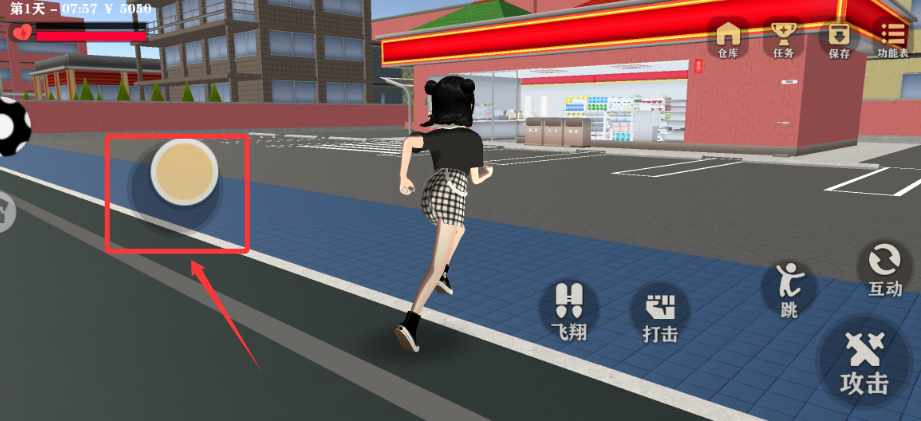 2、利用屏幕左下方的方向轮盘移动人物,穿过教学楼与操场,最终抵达校园零售商店。