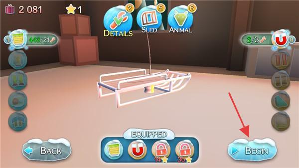 1、装备界面,显示雪橇等道具,点击“BEGIN”开始游戏,上方有“DETAILS”“SUED”“ANIMAL”等功能,可查看详情、升级。