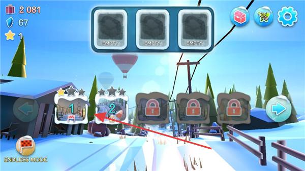 2、关卡选择界面,有“ENDLESS MODE”(无尽模式),可选第2关(解锁状态),其他关卡锁定,点击进入对应关卡。