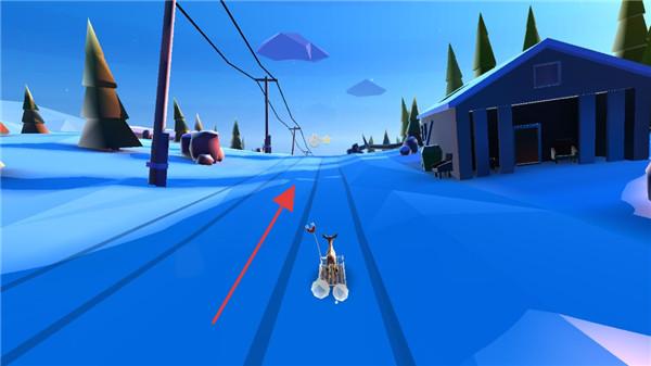 3、游戏场景,操控雪橇在雪地轨道行驶,沿箭头方向前进,场景有房屋、树木,体验雪橇冒险,推进关卡。