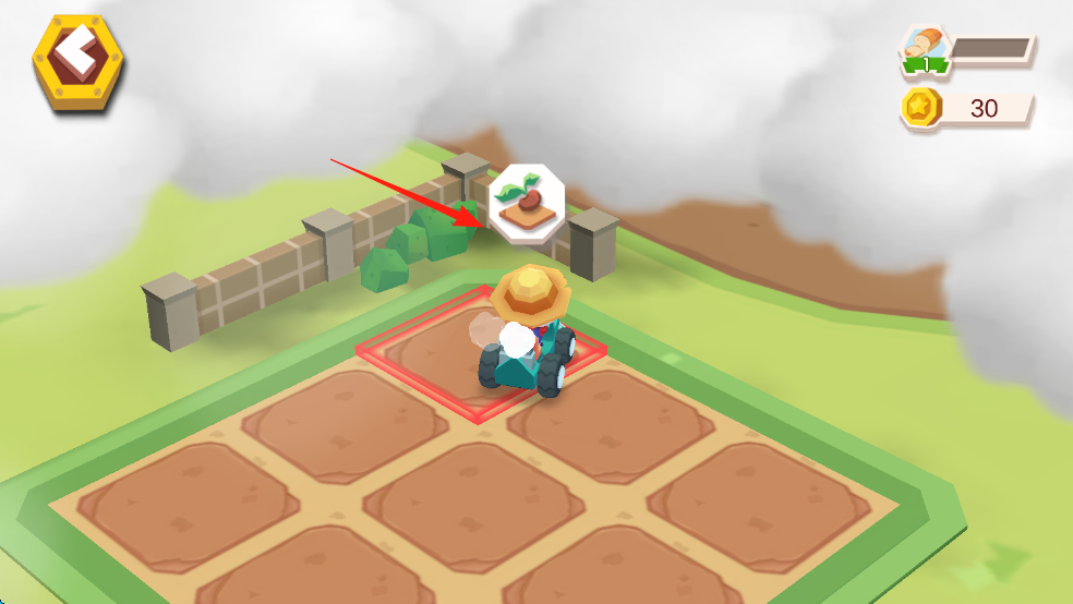 2、驾驶小车,靠近农田,点击种子图标,将种子播撒到土地里。