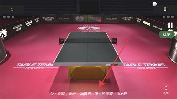 1、比赛界面,呈现乒乓球桌,有“(A)侧旋:向左上30度扫(B)逆侧旋:向右扫”操作提示,可看“提示”,进行击球操作。