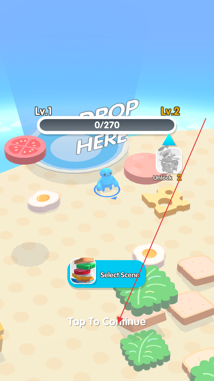 1、点击“TapToContinue”进入游戏,操控蓝色角色在场景移动,收集食材(面包、蔬菜等)。