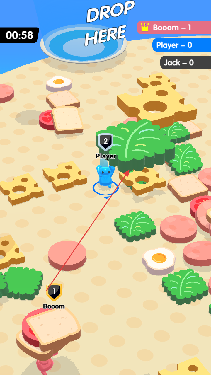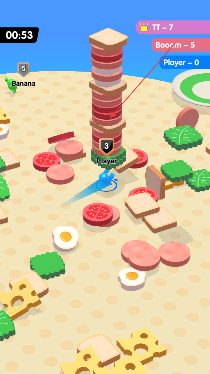2、将收集的食材堆叠,提升自身层级(如显示“Player”的堆叠塔),参与对战或竞争。