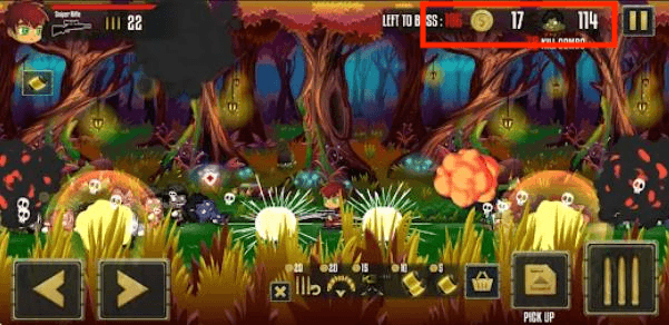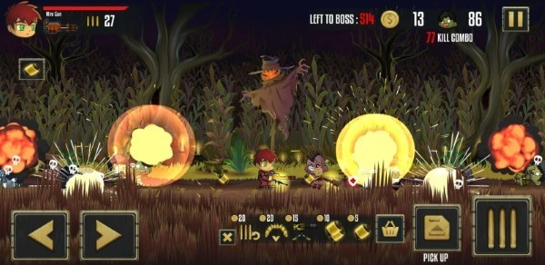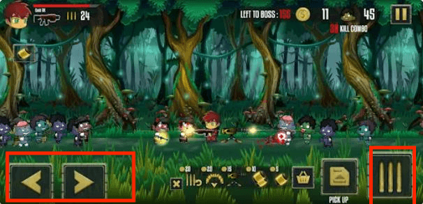 1、左下角按钮控制角色移动,右下角按钮控制角色射击。