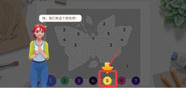 3、接下来就会进入一段游戏指引,点击下方的颜色,然后再点击图中的高亮区域,就可以进行填色了。
