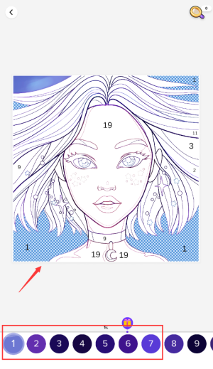 3、根据数字提示,选择底部对应颜色为线稿填色。