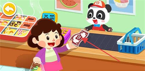 2、到收银台,像图中小女孩用纸币付款,完成购物结算流程。