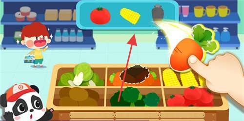 1、进入超市场景,操控角色选食材(如胡萝卜、玉米)放入购物篮,完成采购。