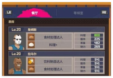 2、厨房员工定位:詹姆斯(食材处理+料理)、拉乌尔(饮料制造+食材处理),技能聚焦厨房核心(食材加工、菜品制作),属性侧重料理、筹备,主打“菜品效率提升”。