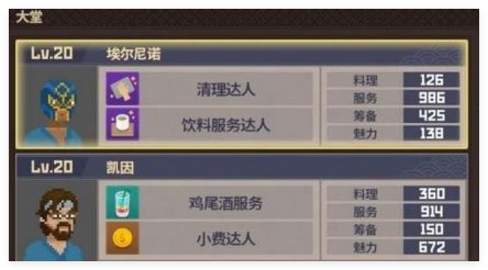 1、大堂员工定位:埃尔尼诺(清理+饮料服务)、凯因(鸡尾酒服务+小费),技能适配大堂场景(清洁、客户服务),属性侧重服务、魅力,主打“客户体验优化”。